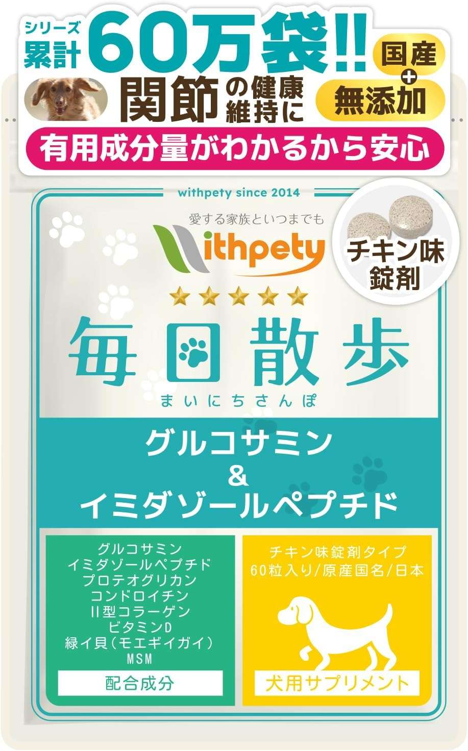 犬の関節の健康維持のための成分がに8種類配合されています。安心安全の国産品質、GMP、ペットフード安全法、残留農薬のポジティブリストに基づき、香料・着色料・保存料・化学調味料を使用せずに製造しています。錠剤はチキン味になっており、食べやすく続けやすい商品です。