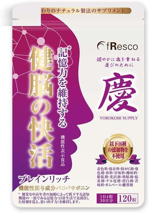 ブレインリッチは、機能性表示食品として消費者庁に届出されている信頼度の高いサプリメントです。記憶力の維持サポートにバコパサポニン成分を配合。機能性関与成分であるバコパサポニンは、中高年の加齢による一部の認知機能(記憶力)の維持に期待できる成分です。また、それ以外にも、脳内の血液と血管の健康維持サポート成分のイチョウ葉エキスやナットウキナーゼ、大麦由来GABA、脳神経や神経物質の生成サポートにDHAパウダーと赤ワインパウダー、カテキンイート緑茶なども配合。脳の認知活動に必須のミネラルである亜鉛と銅も含まれており、オールインワンなサプリメントです。また、16種類の食品添加物が無添加で、安心して続けられるのも大きな魅力です。サプリメントというと、錠剤やカプセルなど飲み込むタイプが多いのに対し、ブレインリッチは小型の錠剤で、噛んで飲めるので、高齢の方でも安全に飲むことができます!複数のサプリメントから必要な成分を摂取するのは大変という方もこれなら1日4粒だけでOKなので、認知症や物忘れサポートのファーストサプリメントとしてもおすすめです!