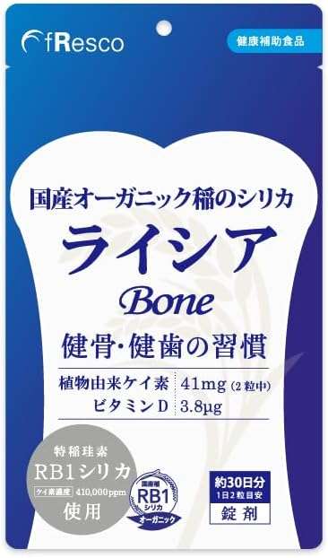 ライシア Boneが堂々の一位です!骨の形成を助ける稲由来RB1シリカを含有しています。超吸収力と多種の健康長寿・美容ミネラルを兼ね備える高品質な珪素RB1シリカ。(※上記、稲由来シリカ・ケイ素は、新聞や刊行書籍等でモニタリング実証試験の結果が公表されています)。特別な製法で、国産稲由来、つまり人間本来の食生活にある植物由来のもので、さらに薬品などを一切使わない事により、体に優しい商品となっていることも評価できます。また、骨に嬉しいビタミンDも配合されている「栄養機能食品」です。2位のRBA boneと同じく、論文発表されている人気の稲由来ケイ素RB1シリカをメインとしていますが、1日のケイ素量は41mg(=換算量シリカ100mg)の通常量である代わりに、価格面では優れています。