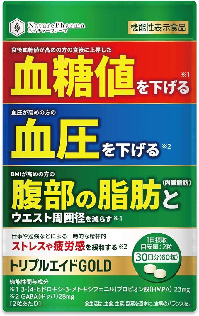 HMPAとGABAのダブルの機能性関与成分で、血糖値・血圧・おなかの脂肪をトリプルサポートします。