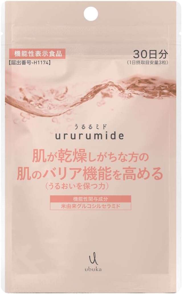 「うるるミド」は肌の乾燥が気になる方におすすめの食品です。主成分として、米由来のセラミドを3粒あたり1.8mg配合いたしました。日本人の主食である米から抽出された植物由来のセラミドが、肌のバリア機能(うるおいを保つ力)を高め、乾燥しがちな肌のうるおいを守るサポートをします。