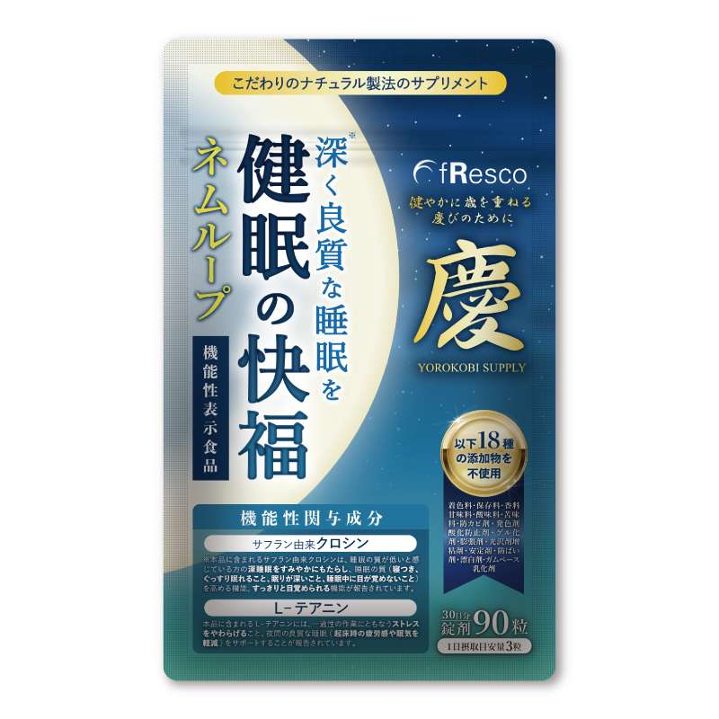 「ネムループ」は『サフラン由来クロシン』 『L-テアニン』のW機能性関与成分とした錠剤タイプの機能性表示食品です。