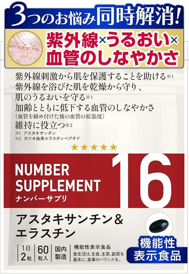 抗酸化力の高いアスタキサンチンを開発した富士フィルムの商品です。紫外線ケアとうるおい・弾力のW機能で、紫外線の影響が気になる方や日焼け止めを塗るだけでは物足りない方へ強力サポート。こだわり成分としてリコピン、ビタミンC、ビタミンEなどを配合して乾燥を防ぎ潤いをキープします。